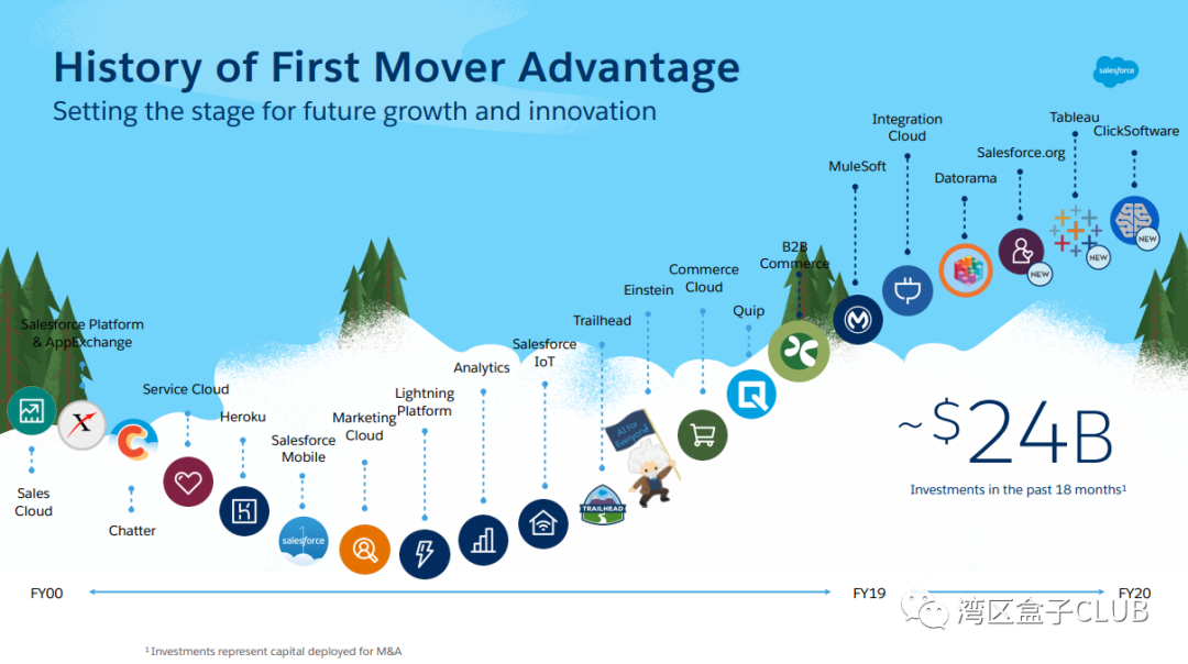该公司一直在通过其企业风险投资部门Salesforce Ventures向初创企业投资。自2009年以来,该合资企业已与375多家公司建立了合作伙伴关系,帮助它们加速了增长,共进行了19次IPO。例如,价值124亿美元的云数据平台Snowflake 最近已申请首次公开募股(就在接下来的几个月内)。该基金的优点在于,他们投资了在技术领域提供独特解决方案的公司,这为在Salesforce专业知识内外扩展提供了机会。这是一项重要优势,可帮助市场领导者在这个动荡,不确定和复杂的世界中保持重要地位。
